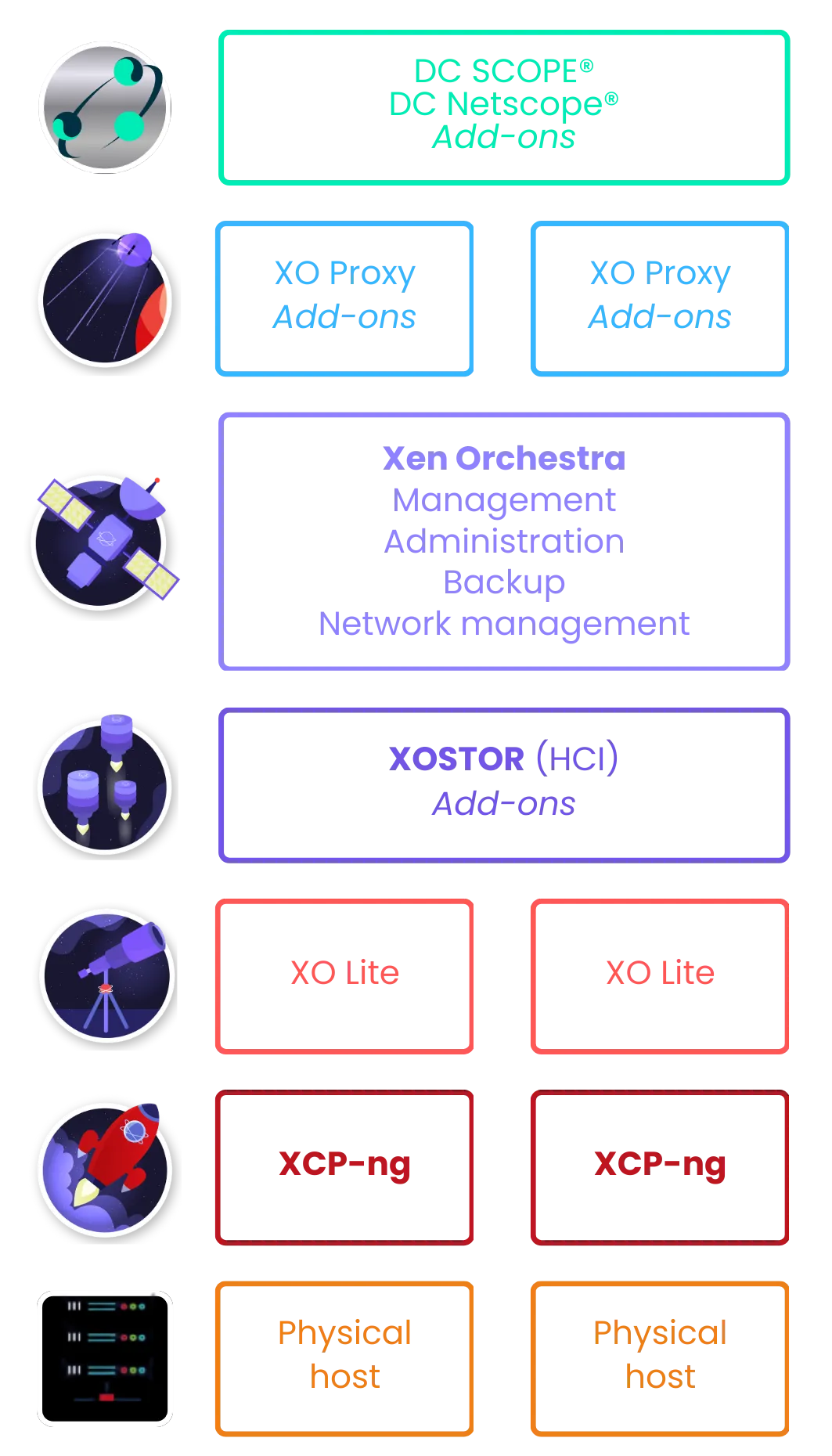 XCP-ng 是一套建立於 Xen Project Hypervisor 之上的開源虛擬化平台,具備高效能、強大資安性,並可與既有工具無縫整合。作為 Vates VMS 的核心引擎,XCP-ng 提供可擴充、高效率的虛擬化環境管理能力,並持續透過研發與長期支援,打造穩定可靠的虛擬化基礎架構。